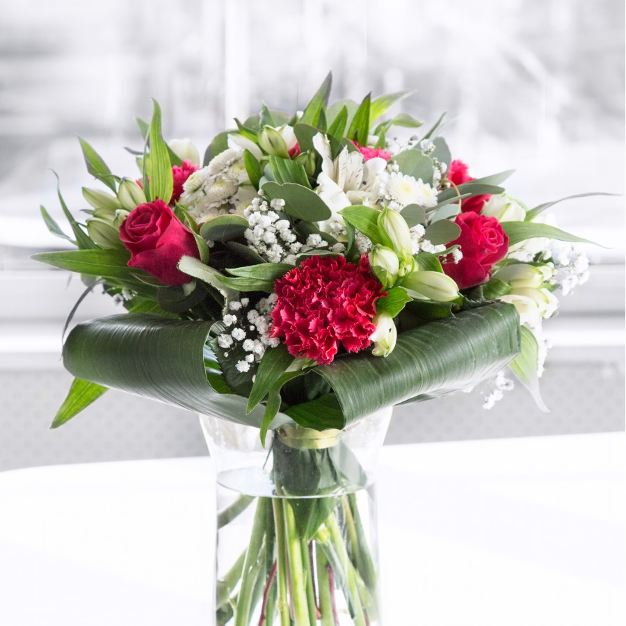 Immerse yourself in the beauty and uniqueness of our stunning bouquet. This arrangement showcases vibrant red roses and charming carnations, harmoniously blended with sweet white chrysanthemums and delicate gypsophila. Accented with elegant white alstroemeria and lush aspidistra leaves, each stem is hand-selected for maximum freshness.